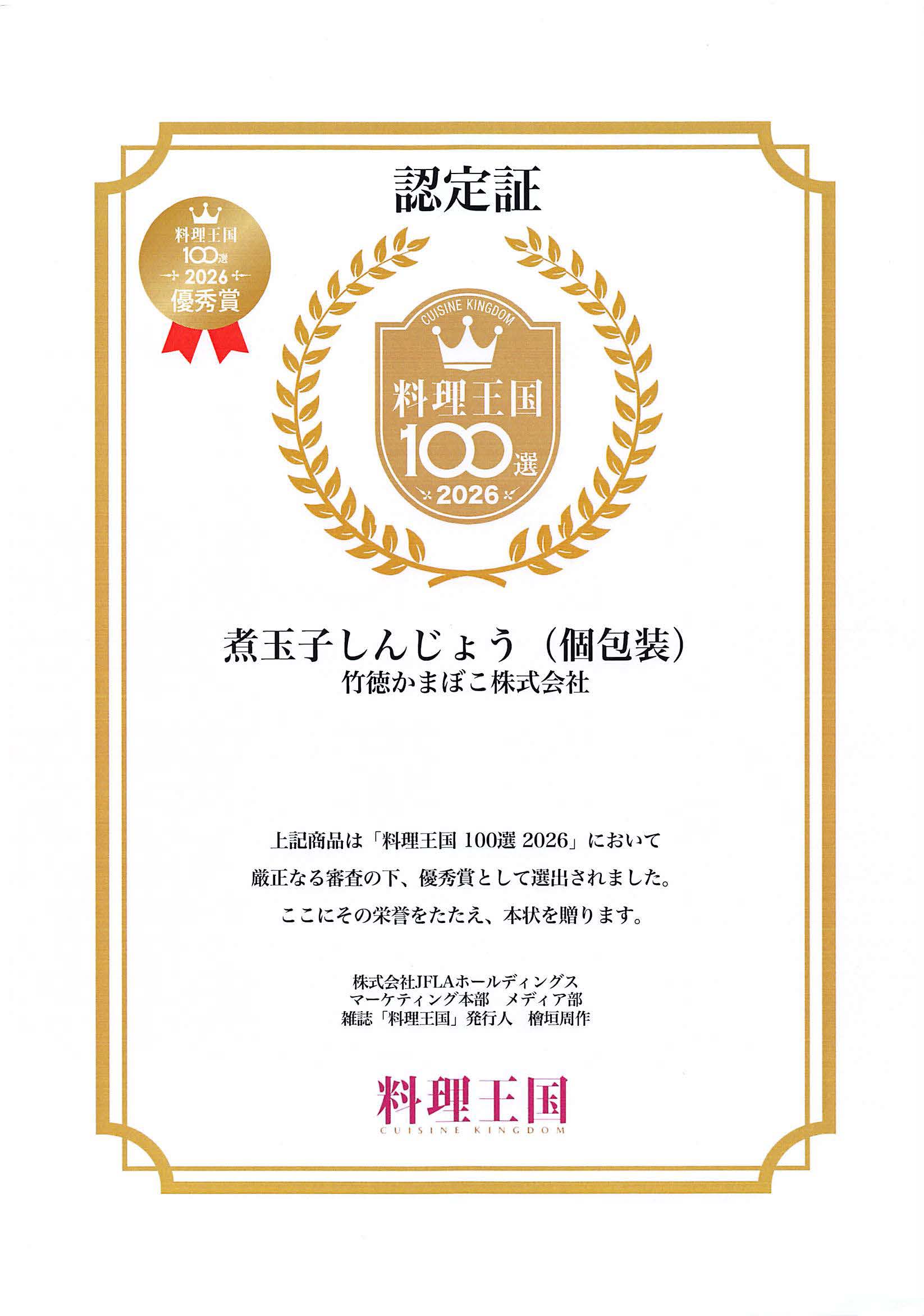 食の専門誌『料理王国』、一流シェフの視点や最新レストラン、世界の食のトレンド、素材の深掘りなどを特集し、食のプロが審査する品評会「料理王国100選」において、「煮玉子しんじょう」がもっとも評価の高い優秀賞を獲得いたしました。